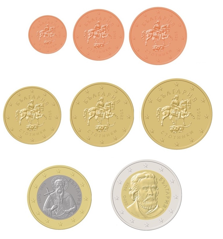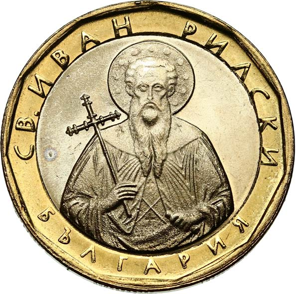 Pièce de 1 euro : Elle honore Saint Jean de Rila (Ivan Rilski), ermite du Xe siècle considéré comme le saint patron et protecteur céleste de la Bulgarie. Fondateur du monastère de Rila, le plus grand et le plus vénéré des monastères orthodoxes bulgares, il incarne la spiritualité et l'identité religieuse bulgares et qui ornait déjà la 1 LEV.