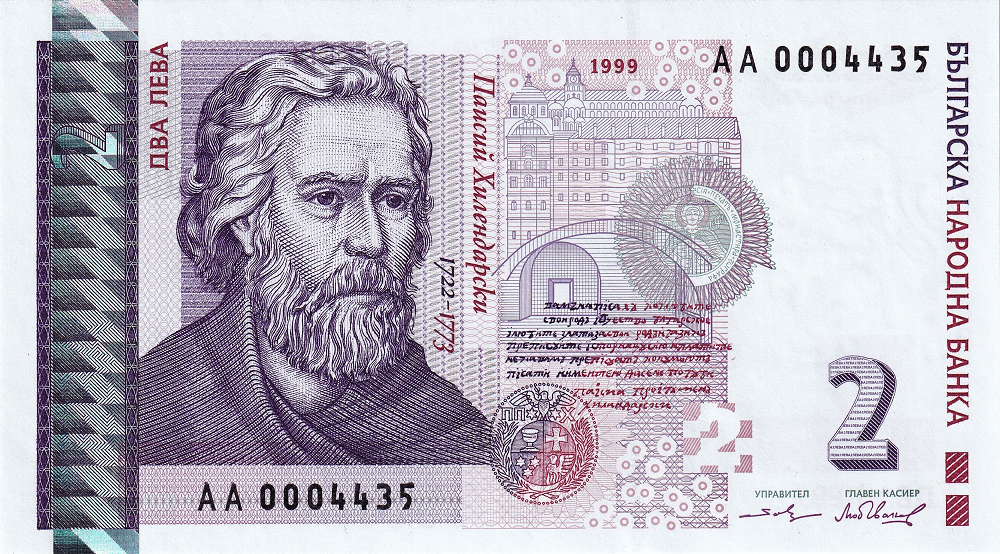- le billet de 2 leva honore Païssi de Hilendar, moine et historien du XVIIIe siècle considéré comme le père de la Renaissance nationale bulgare