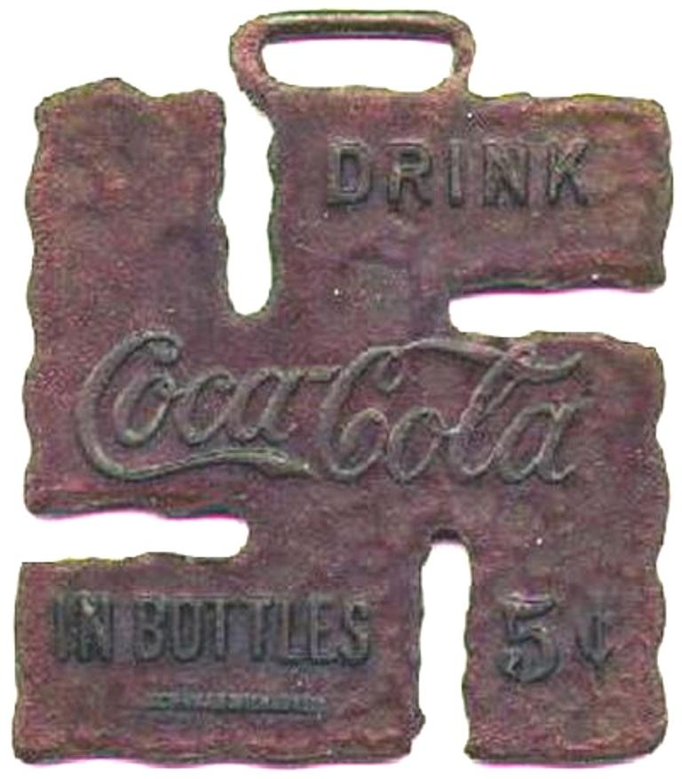 La médaille de Coca-Cola : En 1925, la compagnie Coca-Cola distribua aux États-Unis des médailles porte-bonheur ornées d'une svastika, témoignant de l'acceptation totale du symbole dans la culture populaire américaine avant sa perversion nazie.
