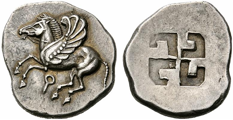 Les monnaies de Corinthe, de Byzance et de Macédoine (Ve-IIIe siècle av. J.-C.) portaient occasionnellement des svastikas comme motifs décoratifs. Le symbole était associé au mouvement cyclique, au soleil et à la chance, sans connotation ethnique ou raciale.